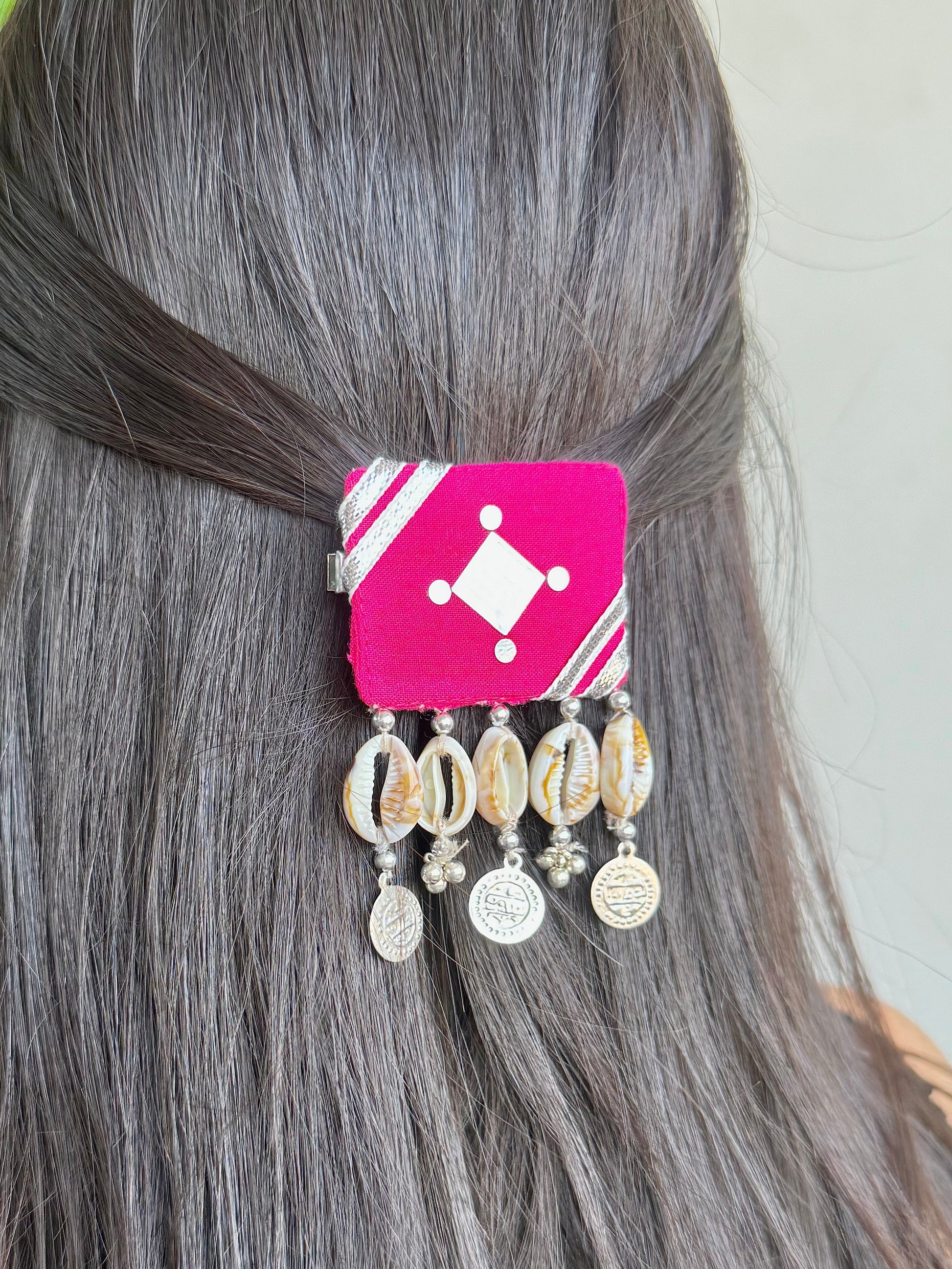 Vibrant handmade hair accessories featuring mirror work, cowrie shells, jingling ghungroos, and traditional gota lace — perfect for festive and ethnic looks.