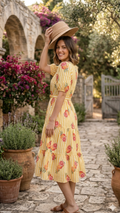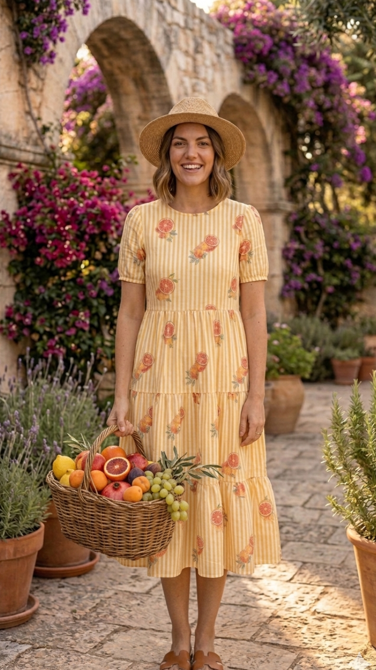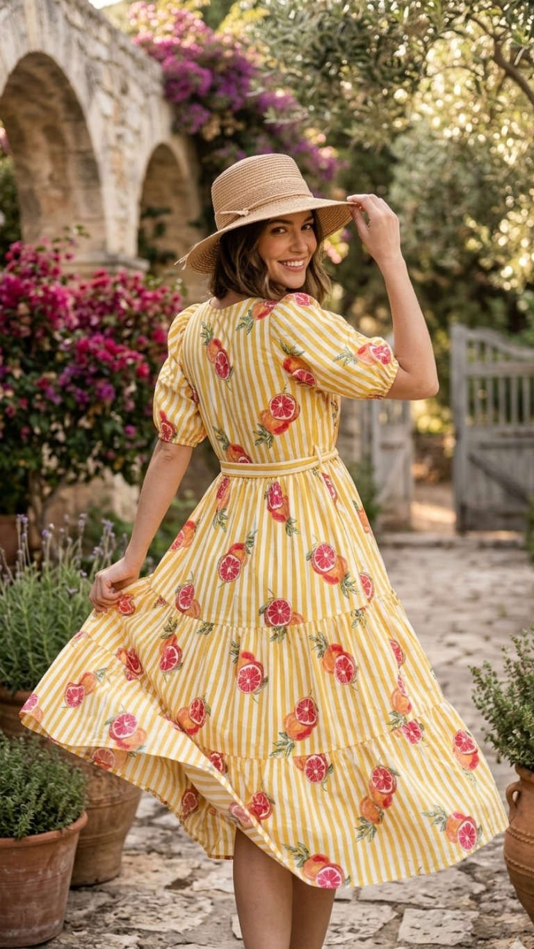 This vibrant Yellow Striped Midi Dress features a playful digital citrus print, soft fabric, and a relaxed tiered fit for all-day comfort. Made from breathable pure cotton, it’s designed to keep you cool while looking chic. With its stylish puff sleeves and flowy silhouette, it’s the perfect choice for casual outings, summer brunches, or your next vacation.