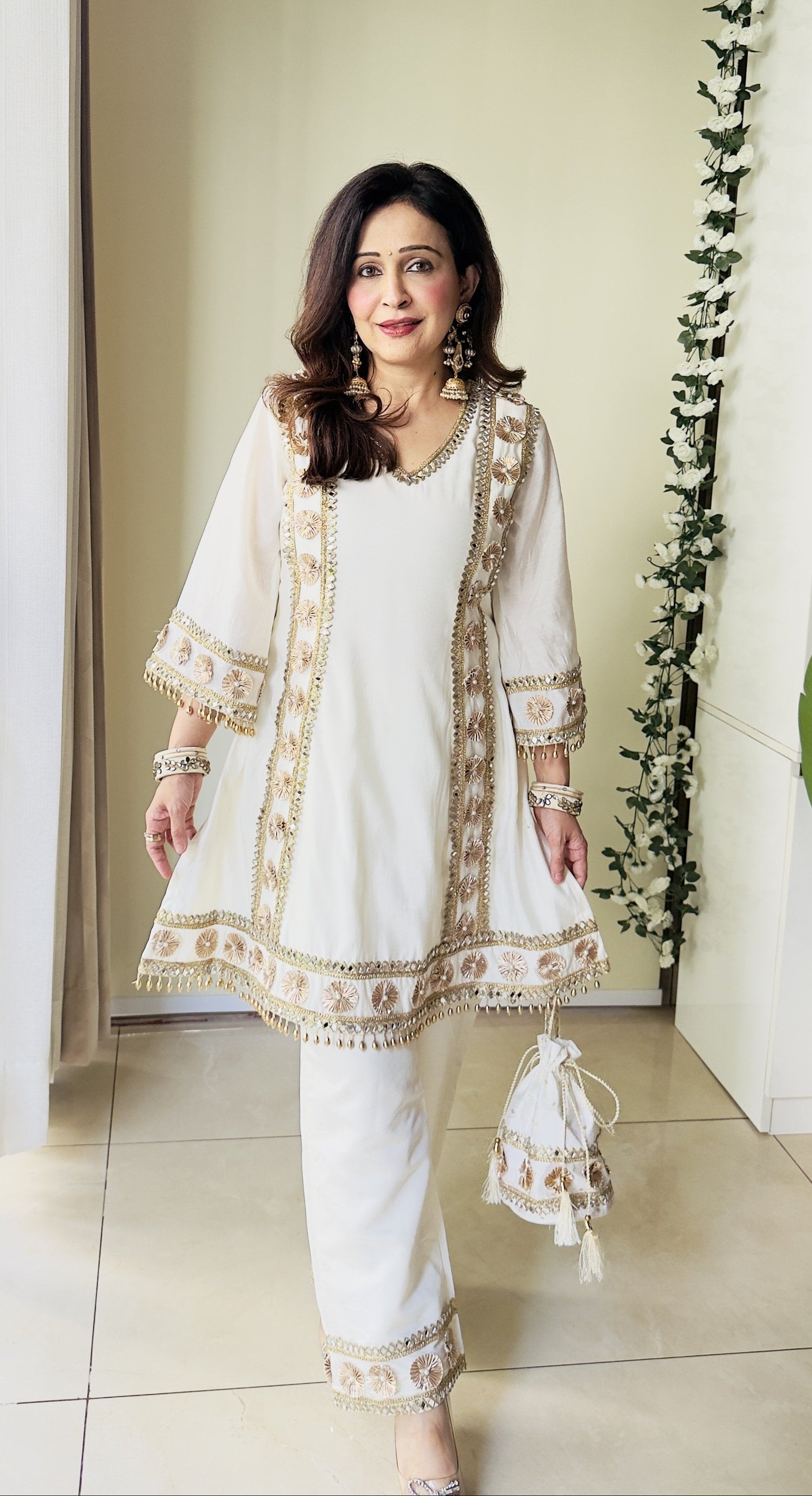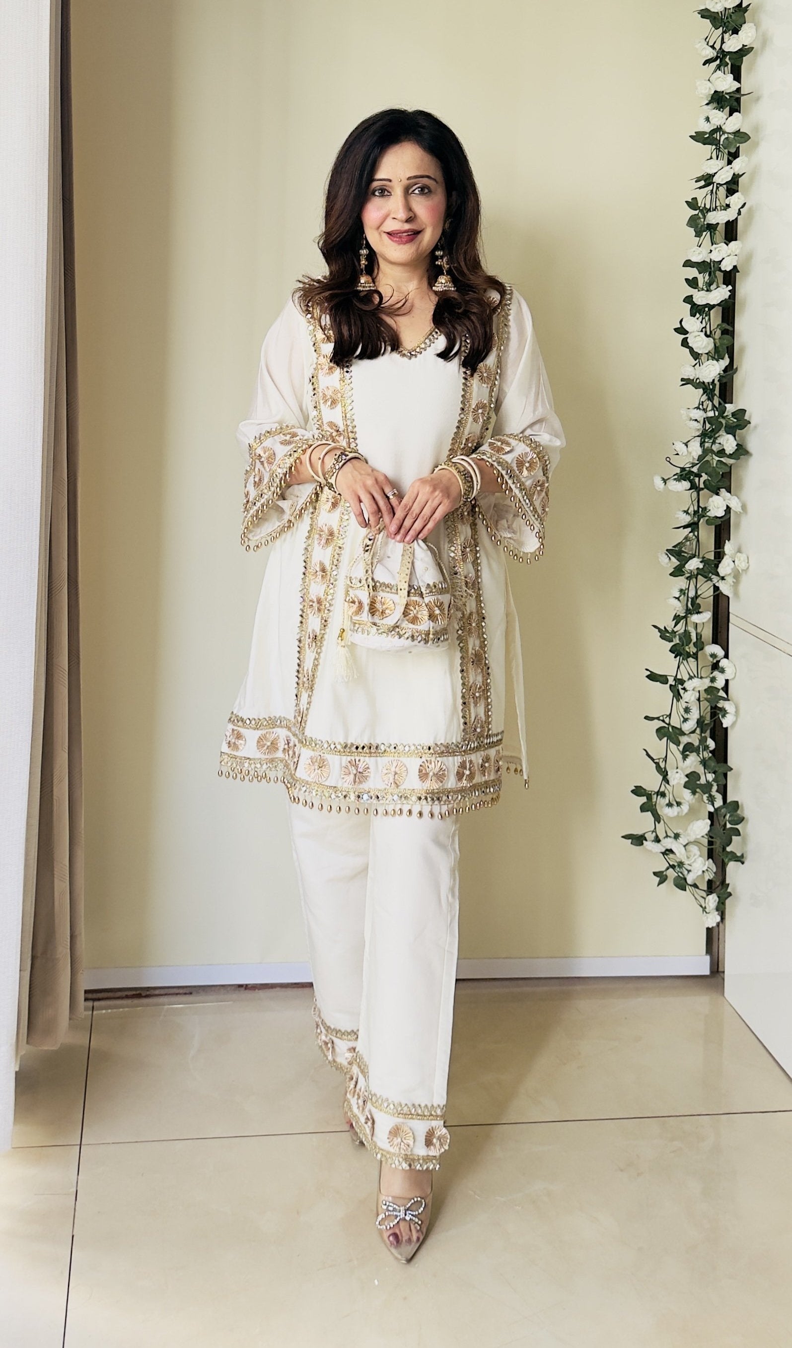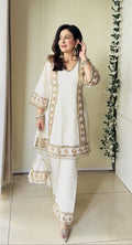 This stunning cord set, crafted from premium Chanderi silk, features beautifully designed lace work and lace floral motifs that add a touch of refined elegance to the outfit. The soft ivory shade highlights the delicate lace panels running along the front, sleeves, and hem, creating a graceful and balanced look.